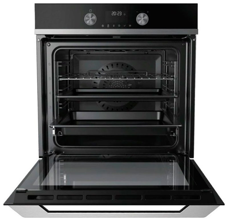 Управление параметрами выполняется при помощи утапливаемых поворотных переключателей и сенсорного дисплея. Три стекла на дверце с теплоотражающим покрытием позволяют ей оставаться прохладной, что повышает безопасность и защищает руки от ожогов. Режим Aquactiva и эмаль легкой очистки помогают устранять загрязнения на внутренних стенках духового шкафа. Для удобства в Haier HOQ-K5AAN3BX реализованы плавное закрывание дверцы и телескопические направляющие.